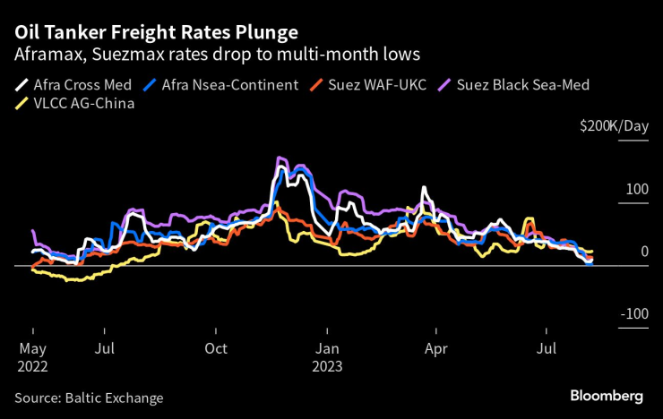 Цените на корабоплаването за кораби от средно големи Aframax до супертанкери се понижиха през последните месеци. Този ход съвпада с намаляването на производството в Саудитска Арабия и ограничаването на износа от Русия, като и двете трябва да влязат в сила през септември.
